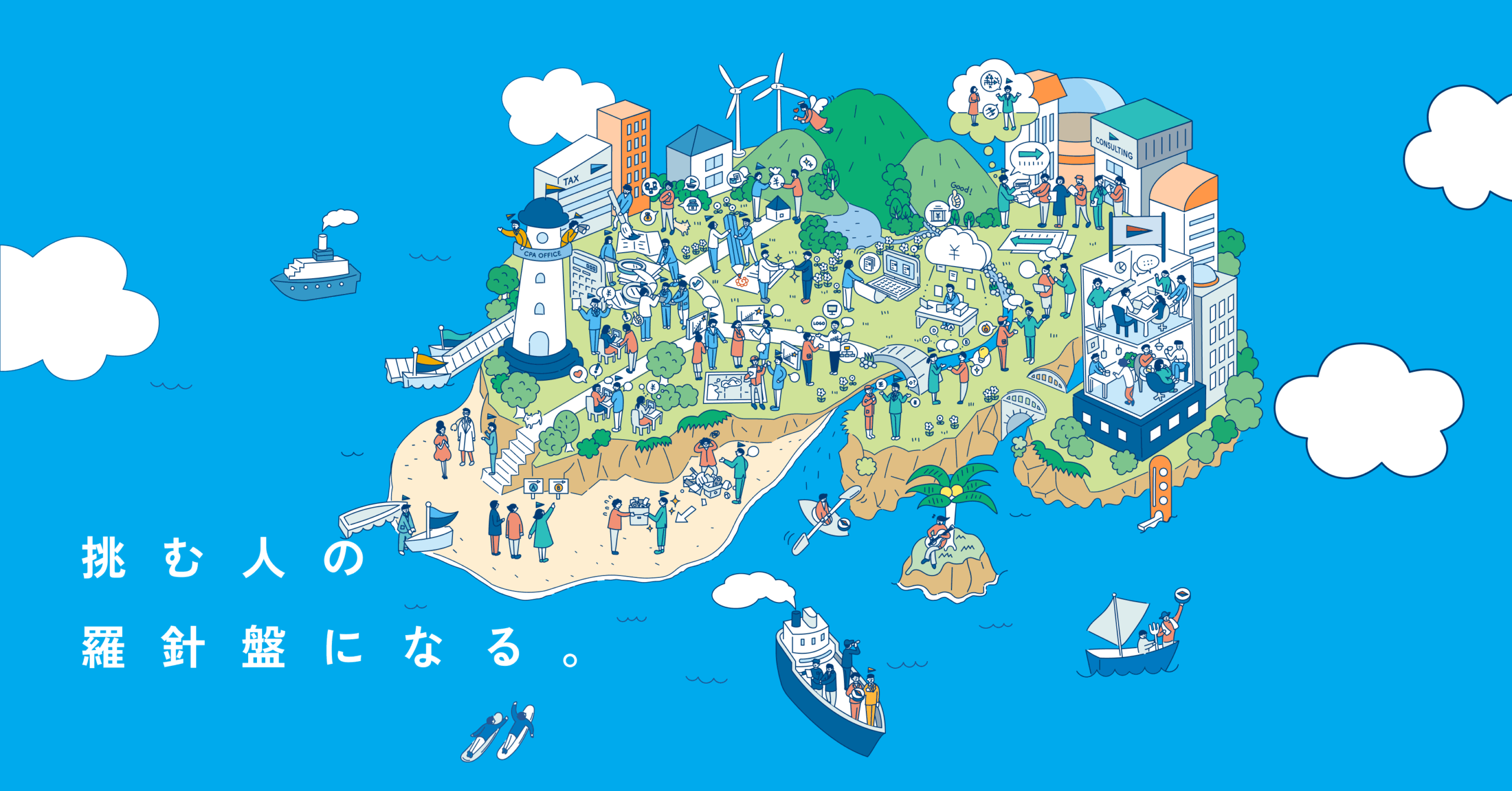 税務・会計・コンサル領域で活動するBLUE WORKSのリブランディング。その多様な業態ゆえの価値の見えづらさの課題に、各組織の役割とサービスの意味を再定義しました。ブランドの核となる「挑戦する人のコーチ」という言葉を軸に、組織図やMVV、ビジョンMAPを設計。羅針盤をモチーフにしたロゴも、進むべき道を象徴する存在に。言葉とビジュアルが結びついたことで、社内に共通の認識と誇りが生まれました。